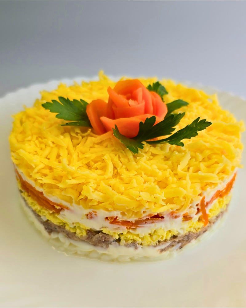 консерва рыбная, сыр, яйцо, лук репчатый, морковь отварная, майонез