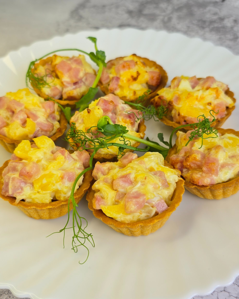 тарталетка, ветчина в/к, яйцо, чеснок, соль, майонез, сыр, ананас консервированный