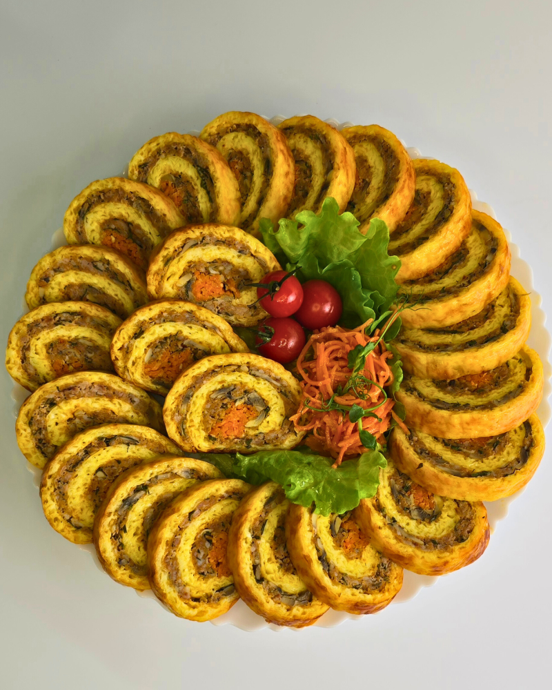 яйцо, крупа манная, сметана, сыр твёрдый, шампиньоны, филе куриное, лук, морковь по-корейски